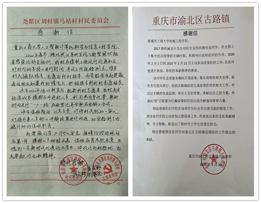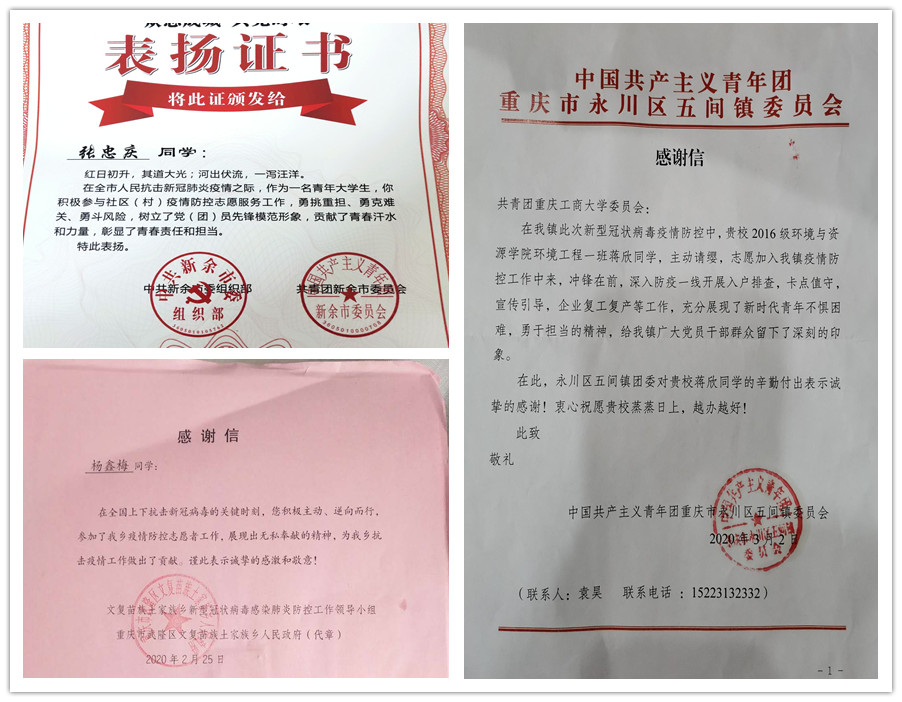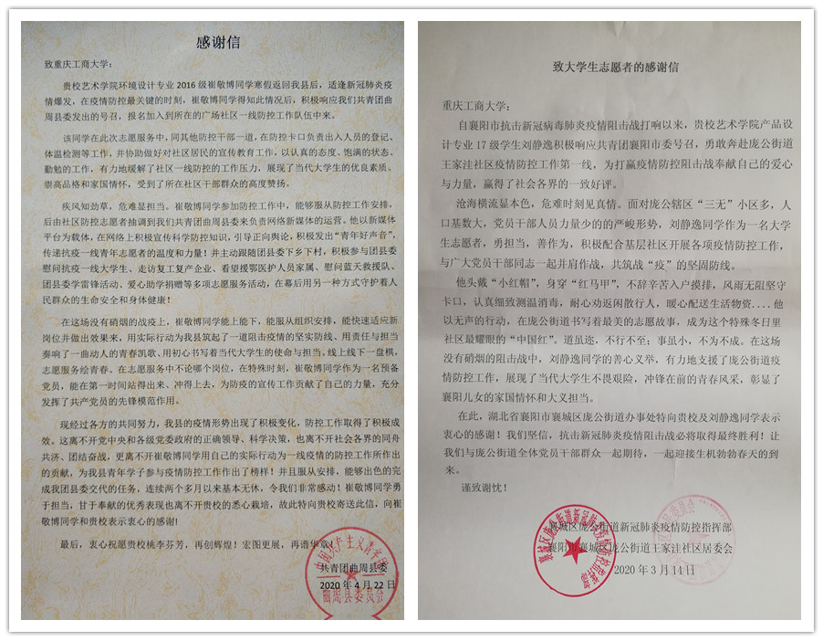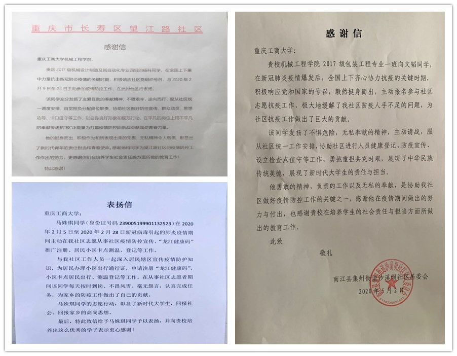“青春由磨砺而出彩,人生因奋斗而升华”新冠肺炎疫情发生以来,重工商大志愿者们以青春的担当,迅速响应,积极投入,同在一线英勇奋战的广大疫情防控人员一道,不畏艰险、冲锋在前,为夺取疫情防控的胜利注入了鲜活的青春力量。3月以来,万象城官网陆续收到河北曲周共青团、重庆永川五间镇共青团、重庆渝北区古路镇人民政府、山西临汾尧都区刘村镇马站村党支部等单位寄来的200余封感谢信,对万象城官网青年在抗“疫”中的表现给予了高度的肯定和赞扬。