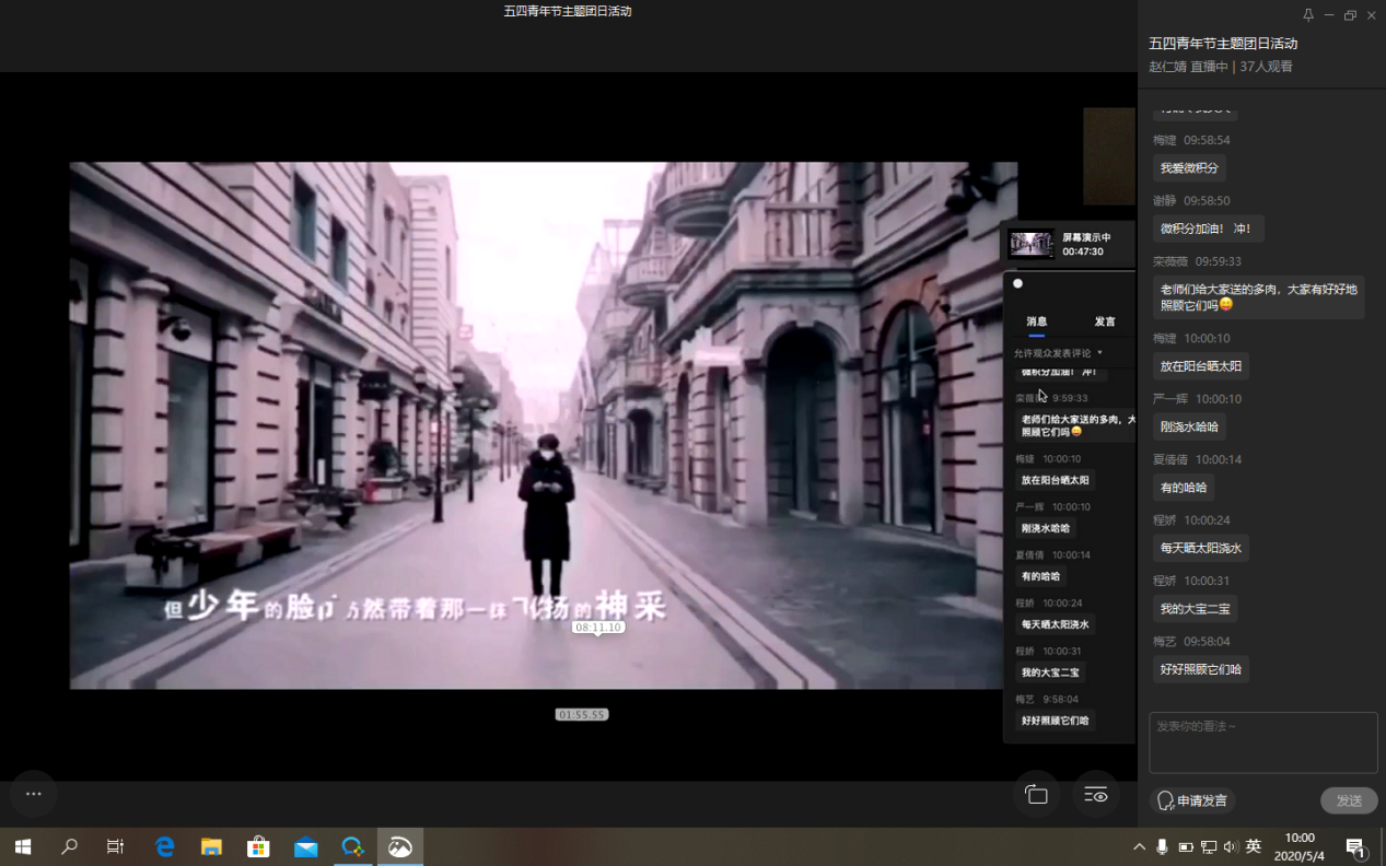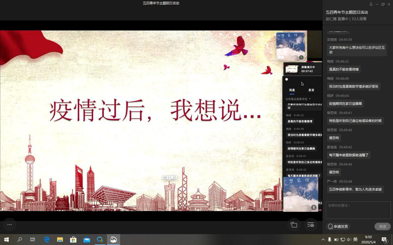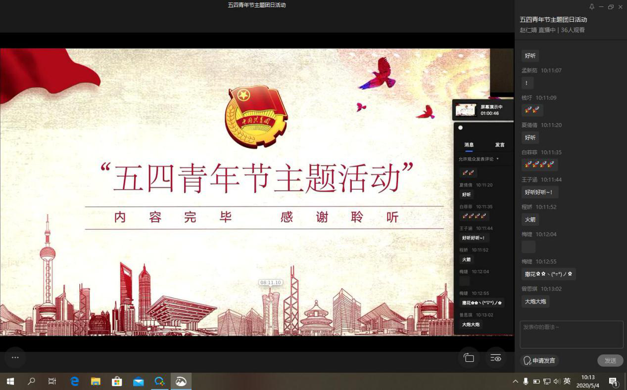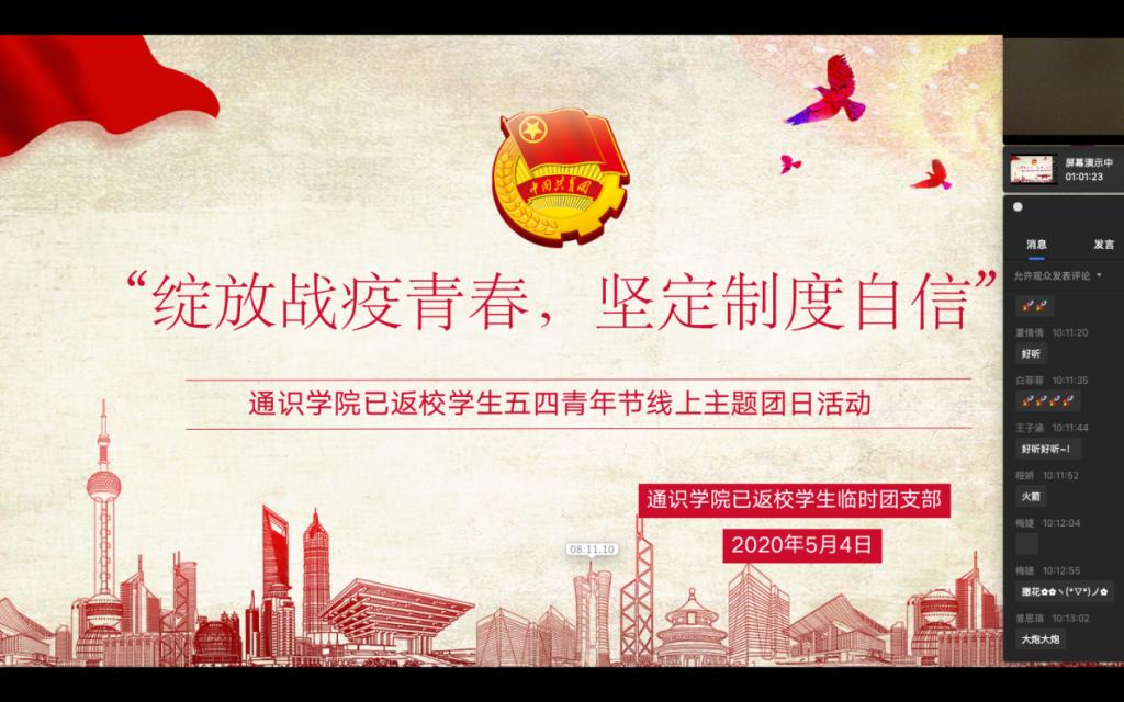 为充分发扬“党有号召,团有行动”的优良传统,加强团组织的思想引领作用,发挥团员的先进性和主动性,让首批返校的47名同学更有归属感和凝聚力,通识学院组建了湖北返校学生临时团支部,组织返校同学积极开展自我服务、自我管理,鼓励他们在特殊时期坚定信心、不惧困难、勇担责任。5月4日上午,已返校学生临时团支部开展了主题为“绽放战疫青春,坚定制度自信”的五四青年节线上主题团日活动。