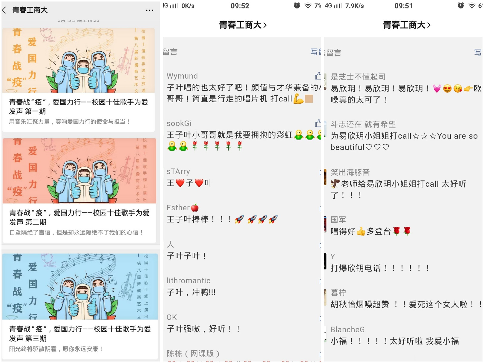 本次十佳歌手线上活动获得万象城官网同学们的广泛好评,同学们在微信留言处积极互动,让本次“为爱发声”线上活动的主题更加的明确。