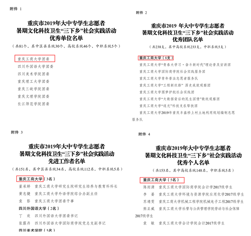 学校在全国大学生“一带一路”专项行动中获评优秀组织单位(全国50个);山城新贸调查队(管理学院BIM学生社团)获全国大学生“一带一路”专项行动优秀团队(全国75支);“工程新丝路”历史成就观察团(管理学院)获评全国三下乡社会实践优秀团队;“青春大学习•奋斗新时代”理论普及宣讲团(财政金融学院)获评团中央“镜头中的三下乡”优秀报道奖。
