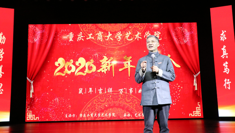 艺术学院艺术团出演的开场舞拉开序幕,激扬动感的舞蹈瞬间将气氛点燃。首先陈运超副校长致辞,他通过对“艺术”二字的诠释,肯定了学院在助推学校美育教育和浓厚校园文化氛围方面所做的积极努力,并寄语新的一年能做更积极的探索与实践。接着学院殷俊院长用“三个更好”简短的总结了学院在2019年所作出的努力和取得的成绩,表达了对全院师生的感谢和祝福,并祝愿艺术学院未来更加美好。