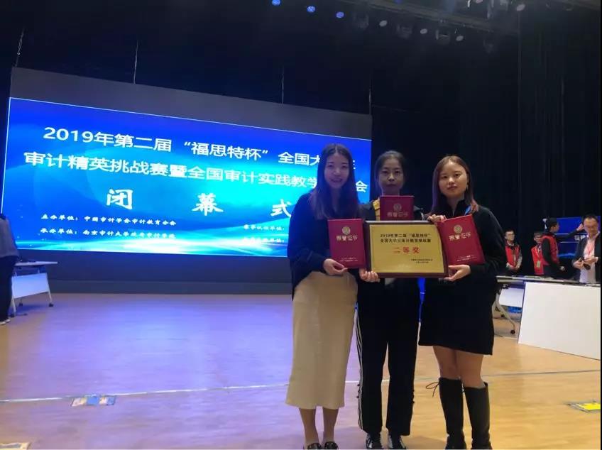 10月26日-27日,由中国审计学会审计教育分会主办,南京审计大学承办的2019年“福思特杯”全国大学生审计精英挑战赛暨全国审计实践教学研讨会在南京审计大学隆重举行。由万象城官网会计学院2017级审计专业学生杨贺、胡苗、何淑伟组成的本科代表队和MPAcc学生彭莉琳、郎鉴、石扬子组成的研究生代表队一路披荆斩棘,表现优异,最终分别斩获全国一等奖、全国二等奖。会计学院审计系和审计硕士中心负责人蒋水全副教授和审计系专任教师李晓羽博士荣获本次大赛的“优秀指导教师”奖。