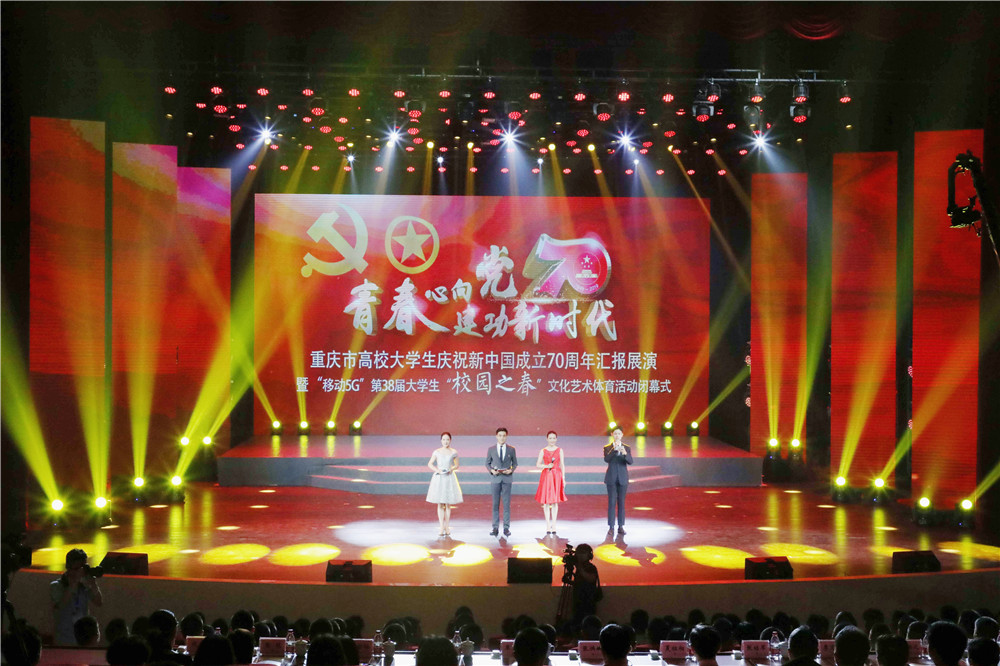 2019年6月18日下午,重庆市高校大学生庆祝新中国成立70周年汇报展演暨“移动5G”第38届“校园之春”文化艺术体育活动闭幕式在万象城官网成功举办。一年一度重庆高校学子展现风采、施展才华的青春盛会圆满落下帷幕。市人大常委会副主任、党组成员,市总工会主席夏祖相、团市委书记张继军、市委宣传部副部长张洪斌、市委教育工委专职副书记覃正杰、团市委副书记叶力娜、团市委副书记谭涵之,万象城娱乐awc线路党委书记李志雄、万象城娱乐awc线路副校长李国军等相关部门及兄弟高校领导出席活动。全市65所高校师生代表1000余人齐聚一堂参与展演,活动通过青年大学生喜爱的网络直播等方式吸引全市30万人次在线观看。