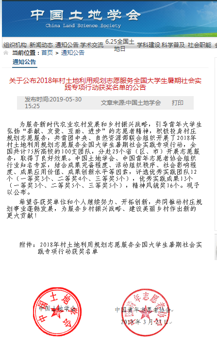去年暑期,共青团中央、自然资源部联合组织开展了2018年村土地利用规划志愿服务全国大学生暑期社会实践专项行动,全国共计75所高校的100支团队,分赴29个省(区、市)2开展志愿服务。活动后,中国土地学会、中国青年志愿者协会、组织行业知名专家,结合成果完备程度、活动组织秩序、社会影响程度、成果应用价值、成果创新水平等因素,对所有调研团队递交的调研成果进行评审。最终,评选出优秀实践团队12个,优秀实践成果13个(一等奖3个、二等奖4个、三等奖5个),精神风貌奖16个。