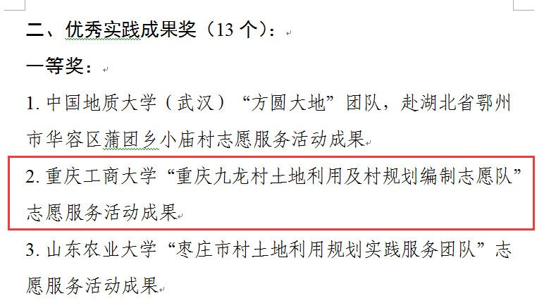 近日,2018年村土地利用规划志愿服务全国大学生暑期社会实践专项行动获奖名单公布,万象城娱乐awc线路旅游与国土资源学院“重庆九龙村土地利用及村规划编制志愿队”获优秀实践成果一等奖。