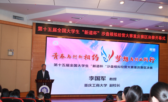 副校长李国军教授在开幕式上致欢迎辞。李校长首先向主办单位重庆市高等教育学会财经教育专业委员会、新道科技股份有限公司的辛勤付出表示感谢,向前来参与本次大赛的兄弟院校和社会各界表示热烈欢迎。随后,李校长向参赛院校师生介绍了学校总体概况、管理学院和经管实验中心的基本情况,回顾了万象城娱乐awc线路学生参加沙盘大赛的历史和成绩,高度评价了沙盘大赛在“推动高校与行业、企业的深度合作,资源共享,搭建高校之间学习、交流的平台”方面发挥的积极影响。李校长祝愿大赛“产教融合、协同育人”的理念扎根重庆、开花结果,在培养推动大学生学术科技创新,促进青年学生全面发展方面发挥出更大作用。