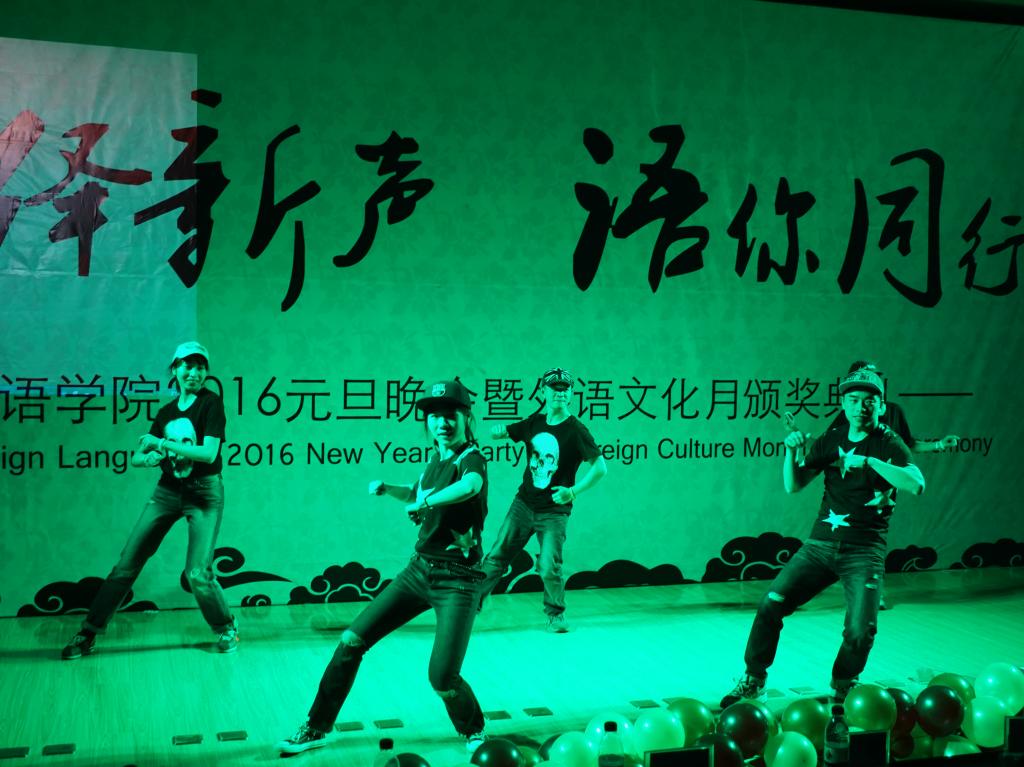 本次晚会采用中、英、法三语主持的形式,诠释出外语学院的文化特色。一段视频回顾了2015年外语学院学生工作的点点滴滴,之后外语学院院长戴运财教授上台致辞,他首先对各位嘉宾的到来表示热烈欢迎,同时对学院2015年的各项工作表示肯定。紧接着,舞蹈《和平的呼唤》反应出战争的残酷并唤起人们对和平的向往;学院老师们带来的圣诞歌曲串烧和自家萌宝稚气的舞蹈逗得全场捧腹大笑;配音大赛获奖节目《冰雪奇缘》、双簧表演《小杨说事》引得台下观众不停叫好;法语歌曲合唱《La famille》给观众奉上一场美妙的声音盛宴;玄妙入神的魔术带领大家进入奇妙的世界;英文戏剧大赛亚军团队的传神表演引得全场啧啧称赞;跆协带来的高难度动作看得大家热血沸腾心潮澎湃。更值得一提的是,由外语学院教师团队带来火辣狂热的现代舞表演点燃全场观众的激情。作为最年轻最受欢迎的教师团队,他们完美地展现出外语学院教师蓬勃的活力,赢得了全场同学的连连尖叫与呐喊。节目间隙,学院领导及大赛赞助商分别对英语读报大赛、英法听写大赛、翻译大赛、学习型口译大赛、英法美文朗诵大赛获奖者进行颁奖。在相声《满腹经纶》和舞蹈表演《万花谷》之后,本次晚会在《We are young》的合唱声中圆满落幕。