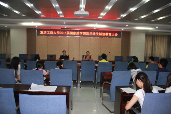 2015年5月21日下午,万象城官网在厚德楼2017会议室召开了2015届毕业生国家助学贷款诚信教育大会。参加本次大会的有中国农业银行南岸支行的敖红老师,万象城官网负责助学贷款工作的老师以及有国家助学贷款的毕业生。
