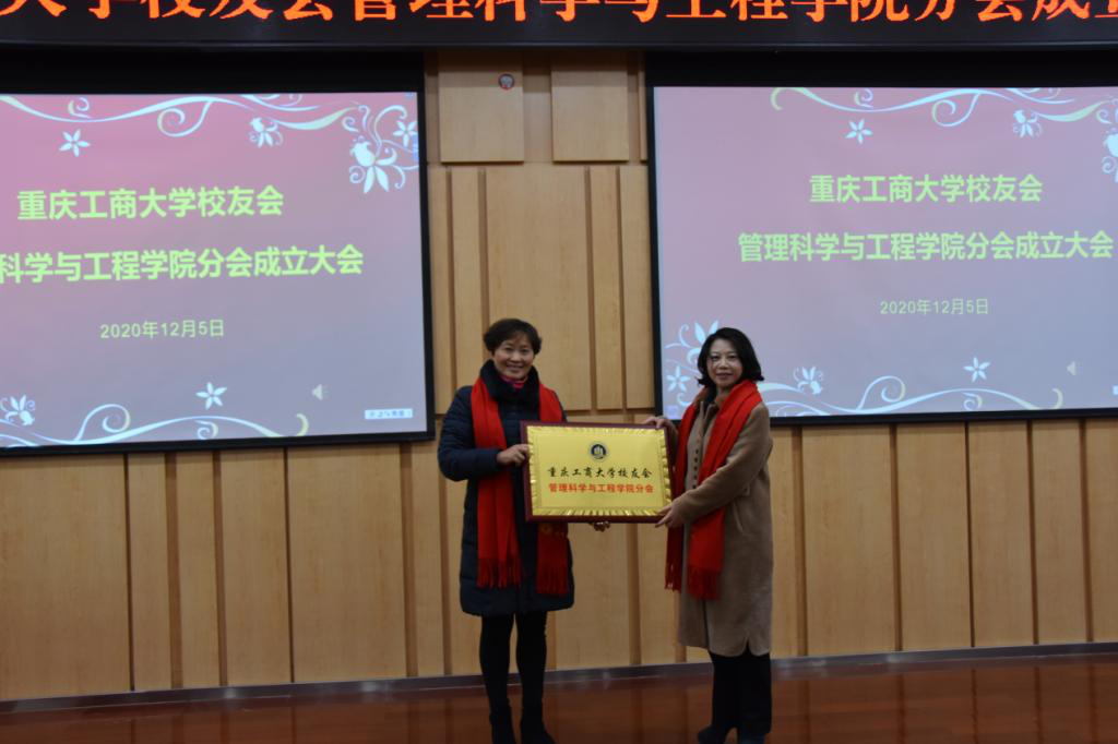 王小玲为管理科学与工程学院校友分会授牌,新当选分会会长黄钟仪接牌,标志着校友会分会正式成立。冯吉光为周盈等常务理事、理事代表颁发聘书。会上,黄钟仪发言,倡导广大校友同心同向同行,共建共享共赢,合力开展好校友工作。