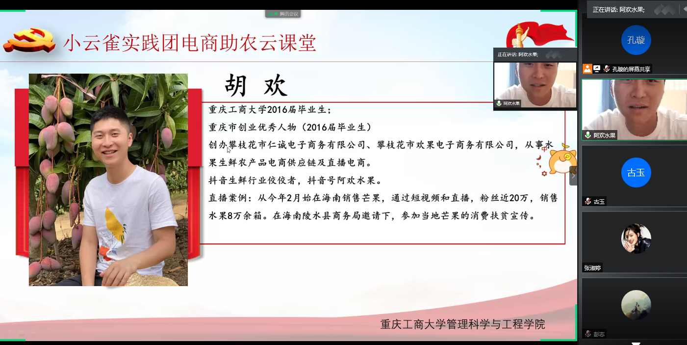 奋斗的青春最美丽。此次活动不仅仅是一场校友分享会,也是一次生动的云课堂。校友用自己奋斗的经历感召着同学们。同学们不仅收获了丰富的直播电商的知识,也进一步明确了自己身上的责任和努力的方向。在校友的激励下,同学们将更好地开展助力脱贫攻坚的实践活动,用自己的专业知识回馈社会。