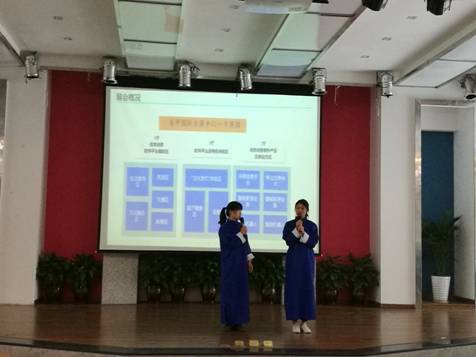 比赛环节过后,刚刚赴广州参加“远华杯”全国大学生会展创意大赛并获得二等奖的江金桓、吴春容、梁玲、代桂菊小组进行了精彩的汇报表演,他们表演的参赛项目“2018中国(重庆)信息消费博览会”,以生动而富有新意的相声形式为大家表演,赢得了在场嘉宾及观众的阵阵掌声和评委的高度评价。