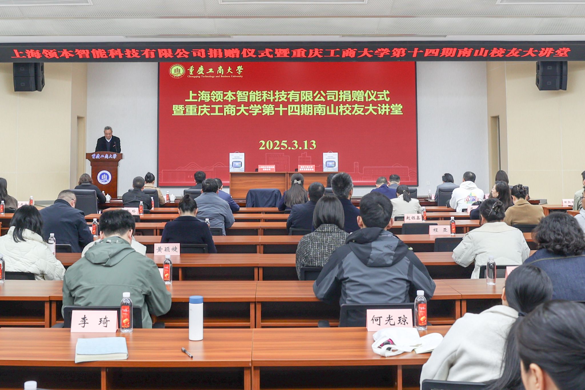 3月13日上午,上海领本智能科技有限公司捐赠仪式暨万象城娱乐awc线路第十四期南山校友大讲堂在明德楼天健报告厅举行。学校党委副书记宋豫、党委常委、副校长李国军,上海领本智能科技有限公司创始人兼CEO、2009届机械专业校友王军博士出席捐赠仪式。捐赠仪式由李国军主持。