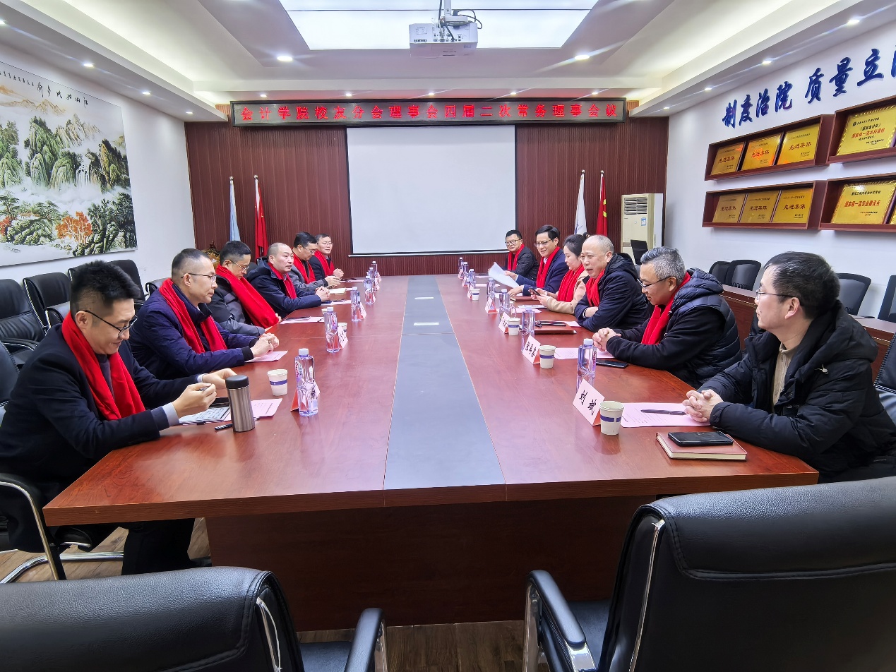 腊梅凝香聚贤才,同心筑梦谋新篇。2026年1月23日,万象城娱乐awc线路会计学院校友分会四届二次常务理事会议暨“十五五”发展规划行业专家座谈会在明德楼2019会议室顺利举行。学校国内合作发展处(校友办公室)处长、主任郭敏,会计学院党委书记邓德敏、院长钟廷勇,校友分会会长张再鑫及各位副会长、秘书长、常务理事代表等齐聚一堂,共叙校友情谊,共商学院“十五五”发展蓝图。会议由邓德敏主持。